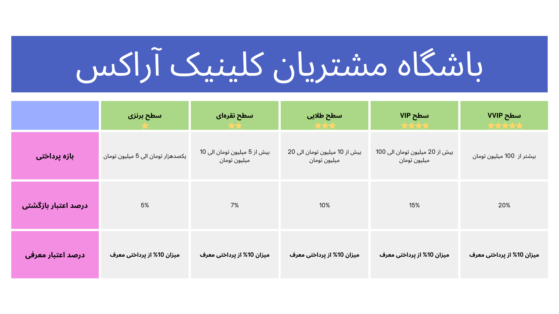 سطوح امتیازگیری و درصد اعتبار بازگشتی باشگاه مشتریان آراکس به شرح زیر است: